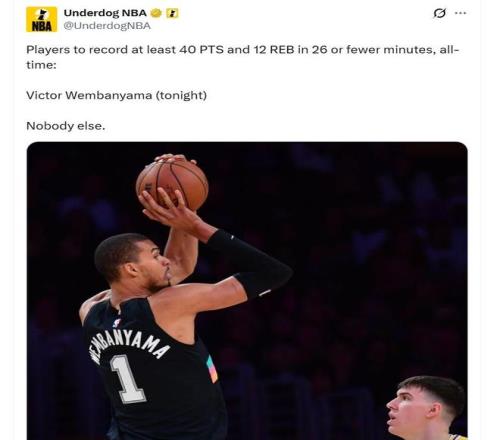 文班亞馬40+12創(chuàng)歷史第1神跡還刷爆紀(jì)錄,詹皇缺戰(zhàn),馬刺完勝湖人