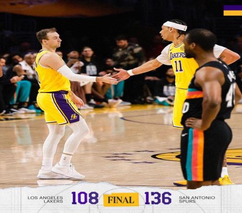 末節(jié)決戰(zhàn),兩隊板凳席末端的球員在場上練兵,比賽早早失去了懸念。布朗尼、哈珀各自帶隊在場上對轟,分差依舊在20分以上,時間逐漸走完。最終,馬刺以136比108完勝湖人,得以斬獲5連勝,紫金軍團則吞下了2連敗。