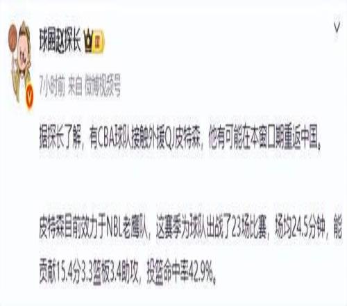 第一階段常規(guī)賽打完之后,不少CBA俱樂部都在積極補(bǔ)強(qiáng)外援陣容,很多球隊都把引援方向投向了澳洲NBL聯(lián)賽。據(jù)媒體人“球圈趙探長”最新報道:“有CBA球隊接觸外援皮特森,他有可能在本窗口期重返中國。”隨后就有媒體人透露消息,目前是北控男籃和山東男籃在追逐,但是皮特森接近加盟北控男籃。北控男籃第一階段的成績并不理想,僅僅取得11勝12負(fù)聯(lián)盟第十一名的成績,外援陣容中只有里勒能夠真正挑起大梁,在裁掉外援基茲林克之后,北控男籃也急需補(bǔ)強(qiáng)外援陣容。