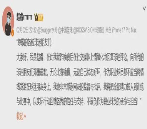 CBA官方宣布:由于趙睿發(fā)表嚴重不當言論,禁賽三場以及罰款五萬......