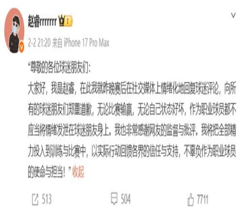 這場風波迅速發(fā)酵,其嚴重性遠超普通的口水仗,由于涉及對特定地域及群體的不當表述,事件很快突破了籃球范疇。據(jù)媒體報道,新疆官方媒體甚至下場發(fā)文,以嚴厲措辭痛斥趙睿的言論嚴重傷害了新疆人民情感,那么在如山壓力之下,趙睿于2月2日晚間通過個人社交媒體公開發(fā)文道歉。