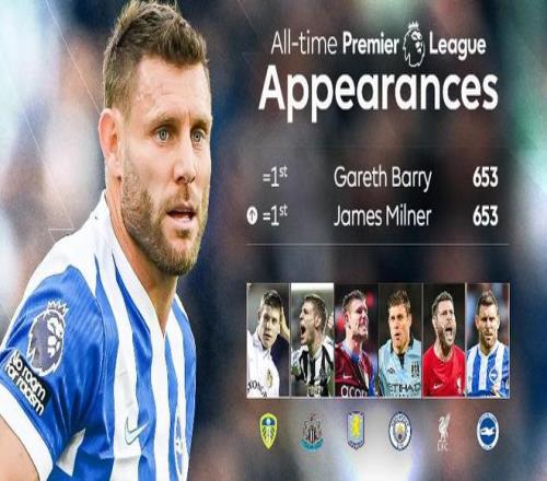 此役客場對陣維拉,米爾納在比賽第22分鐘替補登場,這位40歲的英格蘭中場迎來英超生涯第653次出場,這使得他追平了巴里保持的英超歷史出場紀錄。