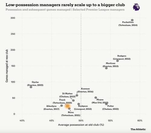 這一點可以通過數(shù)據(jù)略微量化。這里有一張稍顯不同尋常的圖表。它統(tǒng)計了那些從其他英超俱樂部跨入“大俱樂部”的主教練(大俱樂部定義為在英超征戰(zhàn)超過15個賽季的俱樂部——阿森納、切爾西、埃弗頓、利物浦、曼城、曼聯(lián)和熱刺)。橫軸是他們在原俱樂部的平均控球率,這大致反映了戰(zhàn)術(shù)風(fēng)格;縱軸是他們在新俱樂部執(zhí)教的場次,粗略衡量成功程度。