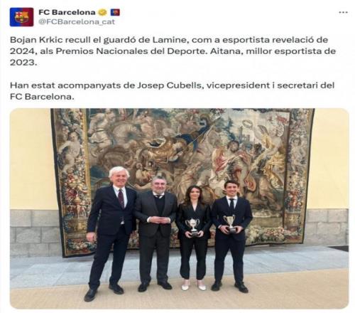 2月11報(bào)道 巴薩邊鋒亞馬爾獲得西班牙國(guó)家體育獎(jiǎng)2024年最佳新人運(yùn)動(dòng)員獎(jiǎng),由博揚(yáng)代為領(lǐng)獎(jiǎng)。西班牙國(guó)家體育獎(jiǎng)?lì)C獎(jiǎng)典禮在2026年2月11日進(jìn)行,表彰2023年、2024年的杰出體育成就。亞馬爾2024年表現(xiàn)出色,幫助西班牙國(guó)家隊(duì)贏得歐洲杯冠軍,獲得2024年最佳新人運(yùn)動(dòng)員獎(jiǎng),亞馬爾沒有出席頒獎(jiǎng)典禮,由巴薩足球部門協(xié)調(diào)員博揚(yáng)代為領(lǐng)獎(jiǎng)。