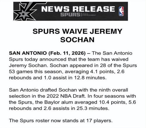 北京時(shí)間2月12日,圣安東尼奧馬刺隊(duì)官方宣布,球隊(duì)已裁掉杰里米-索漢。本賽季,索漢代表馬刺出戰(zhàn)了53場比賽中的28場,場均登場12.8分鐘,得到4.1分、2.6個(gè)籃板和1.0次助攻。
