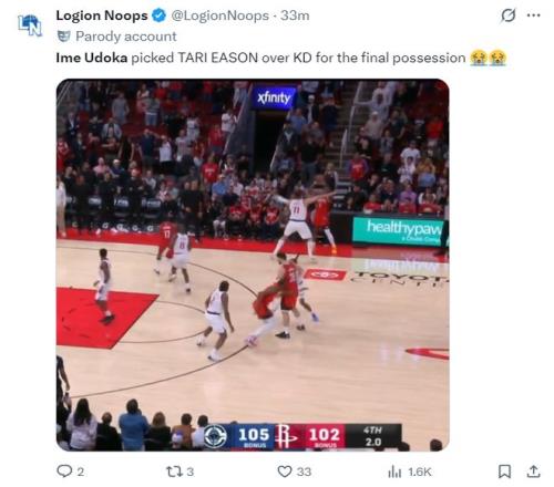 這場(chǎng)比賽最離譜的就是烏度卡最后一個(gè)暫停的布置,他居然沒(méi)有為超級(jí)巨星,大跳投三分之王杜蘭特畫一個(gè)接球干拔的戰(zhàn)術(shù),最后這個(gè)三分出手是伊森完成。美媒LN寫道:烏度卡最終選擇伊森出手絕平三分而非杜蘭特,痛哭表情。