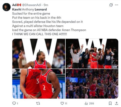 快船在一度落后火箭15分的情況下完成了大逆轉(zhuǎn),休斯頓火箭隊出現(xiàn)了多達(dá)20次失誤是因為他直接敗因,而快船贏下比賽的關(guān)鍵就是科懷-倫納德這位34歲的老將,他在末節(jié)不僅拿到19分還命中了制勝的準(zhǔn)絕殺2+1跳投。