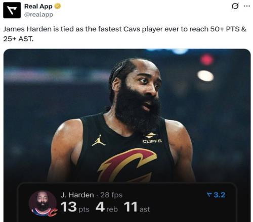 在輕松劃水的情況下,哈登加盟騎士前三場還是交出場均19.3分5.3板8.7助1.3帽全能表現(xiàn),這讓哈登并列成為騎士隊史達(dá)成50+得分和25+助攻最快球員。