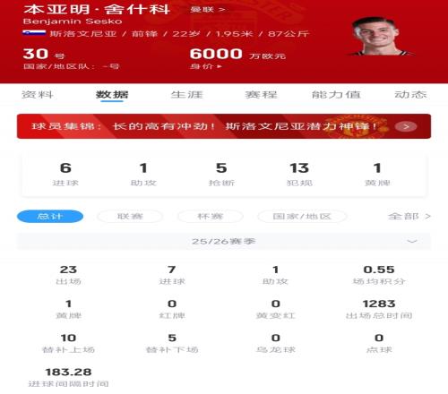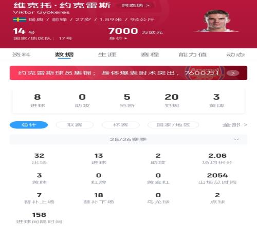 約克雷斯本賽季代表阿森納出戰(zhàn)32場比賽,在2054分鐘的出場時間里貢獻13粒進球和2次助攻;舍什科代表曼聯(lián)出戰(zhàn)23場比賽,在1283分鐘的出場時間里貢獻7粒進球和1次助攻。目前22歲的舍什科德轉(zhuǎn)身價為6000萬歐元,27歲的約克雷斯身價則是7000萬歐元。