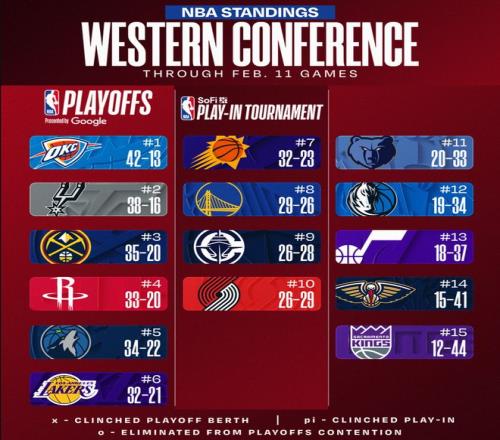 北京時間2月12日NBA常規(guī)賽打完,休斯頓火箭隊剛剛坐了一天的西部第三又下落到西部第四,而且掘金擊敗灰熊后跟火箭再度拉開了1個勝場差,雷霆則拿到2連勝,馬刺則拿到6連勝,兩支西部前二的球隊勝場差依舊是3.5個勝場。