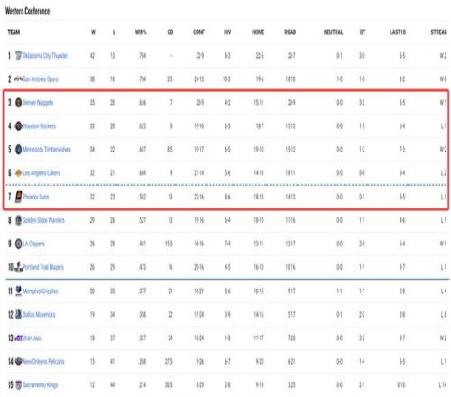 掘金、火箭、森林狼、湖人四支球隊的勝場差只有2個,掘金只領(lǐng)先火箭1個勝場,火箭只領(lǐng)先森林狼0.5個勝場。