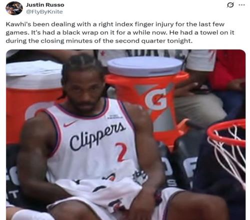 其實(shí)他的手指已經(jīng)纏上了黑色繃帶有一段時(shí)間了,本場(chǎng)比賽鏡頭數(shù)次拍到下場(chǎng)后小卡用毛巾緊緊裹住受傷的手指。