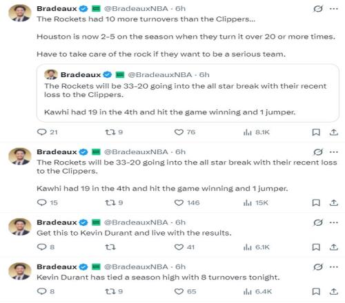 杜蘭特本場(chǎng)比賽出現(xiàn)了8次失誤創(chuàng)造賽季新高,火箭隊(duì)的失誤次數(shù)比快船隊(duì)多出了 10 次,當(dāng)火箭隊(duì)失誤達(dá)到 20 次或更多時(shí),他們?cè)诒举惣镜膽?zhàn)績是 2 勝 5 負(fù)。
