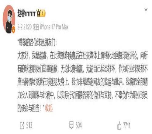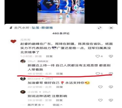 有不少網(wǎng)友還在趙睿的社交平臺(tái)上留言,面對(duì)屬地為IP地址為新疆的球迷留言稱:北京爭(zhēng)冠無(wú)望,而趙睿直接回復(fù):“新疆邊上待一待,自己人民都沒(méi)有主觀思想,都是別人帶著跑?!绷硗庖幻陆蛎蕴岬剿P球不中,趙睿更是回懟:“回去打馕去”。