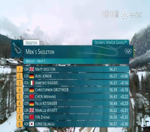 男子鋼架雪車第1組賽果:三位中國選手分別排在第5、第8、第12