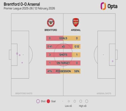 Opta統(tǒng)計,阿森納和布倫特福德兩隊加起來在上半場只有4腳射門(3腳還是對方貢獻的),本賽季英超比賽中只有去年12月狼隊對布倫特福德的比賽上半場雙方射門次數(shù)更少(3次)。