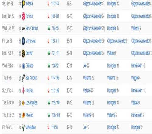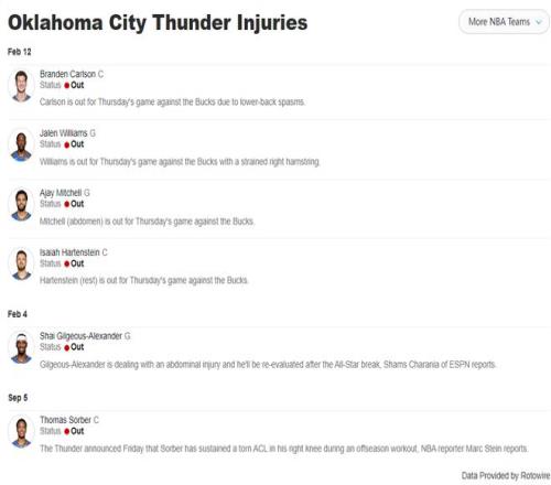亞歷山大自2月5日起就因為腹部拉傷缺席,他的傷勢也是在全明星周末后才復查,他肯定讓自己這個賽季至少出席65場比賽,因為他還想連莊MVP,但也有再度受傷的風險,這是一個巨大的隱患。