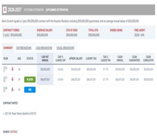 杜蘭特此前與火箭隊達成了兩年9000萬的提前續(xù)約,他本賽季的薪水是5470萬,26-27賽季4390萬,27-28賽季4609萬(球員選項),這份合同結(jié)束后他因為38歲條款就只能一年一簽,他的薪資也必然會迎來大幅度的下滑,因為這份合同執(zhí)行完他就39歲(也有可能退役)。