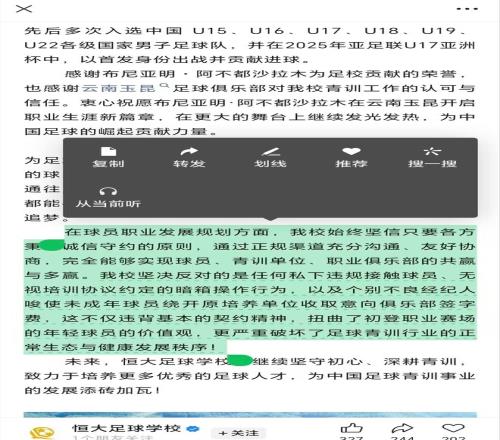 而在恒大足校的官宣中,著重提到了“在球員職業(yè)發(fā)展規(guī)劃方面,我校始終堅信只要各方秉持誠信守約的原則,通過正規(guī)渠道充分溝通、友好協(xié)商,完全能夠?qū)崿F(xiàn)球員、青訓單位、職業(yè)俱樂部的共贏與多贏。我校堅決反對的是任何私下違規(guī)接觸球員、無視培訓協(xié)議約定的暗箱操作行為,以及個別不良經(jīng)紀人唆使未成年球員繞開原培養(yǎng)單位收取意向俱樂部簽字費,這不僅違背基本的契約精神,扭曲了初登職業(yè)賽場的年輕球員的價值觀,更嚴重破壞了足球青訓行業(yè)的正常生態(tài)與健康發(fā)展秩序”!