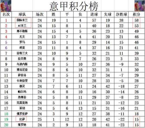 積分榜方面,AC米蘭今天先賽贏球,現(xiàn)在他們和國米都是賽了24輪,AC米蘭5分之差繼續(xù)位居第2,緊追榜首的國米。那不勒斯49分排在第3,尤文,羅馬46分排在第4,第5。