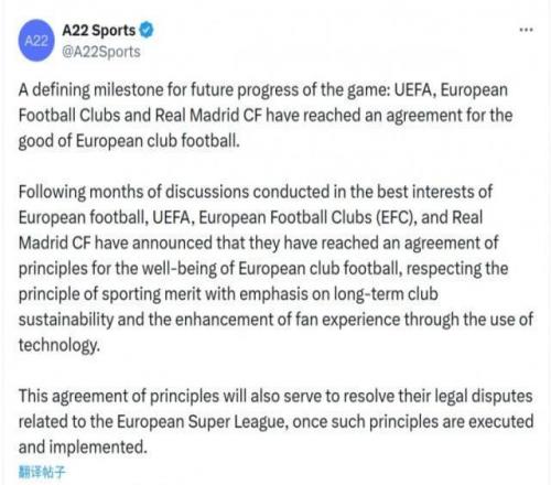 2月13報(bào)道 歐超公司A22社媒發(fā)表聲明,確認(rèn)歐足聯(lián)、皇馬、歐洲俱樂部協(xié)會(huì)達(dá)成原則協(xié)議,正式終結(jié)持續(xù)5年的歐超聯(lián)賽項(xiàng)目及相關(guān)法律糾紛?!白闱蜻\(yùn)動(dòng)未來發(fā)展的里程碑:歐足聯(lián)、歐洲俱樂部協(xié)會(huì)與皇馬已達(dá)成有利于歐洲俱樂部足球發(fā)展的協(xié)議。歷經(jīng)數(shù)月以歐洲足球最佳利益為宗旨的磋商,歐足聯(lián)、歐洲俱樂部協(xié)會(huì)與皇馬宣布達(dá)成原則性協(xié)議,旨在保障歐洲俱樂部足球的健康發(fā)展。該協(xié)議恪守競技價(jià)值原則,著重提升俱樂部長期可持續(xù)性,并通過技術(shù)手段優(yōu)化球迷觀賽體驗(yàn)。該原則性協(xié)議在落實(shí)執(zhí)行后,也將有助于解決歐洲超級聯(lián)賽的相關(guān)法律糾紛。”