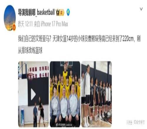 然而,近日,根據(jù)知情人士透露,中國女籃又冒出一個2米20的天才大個子了。據(jù)悉,這名天才中鋒來自于天津女籃,名字為曹熙琛,今年只有14歲,但身高已經(jīng)長到了2米20。而且,根據(jù)該知情人士透露,曹熙琛原先并不是練籃球的,在進入到籃球項目之前,她是學習排球的。只不過,由于后來身高長得非???,最終不得不放棄排球,轉(zhuǎn)而練起了籃球。