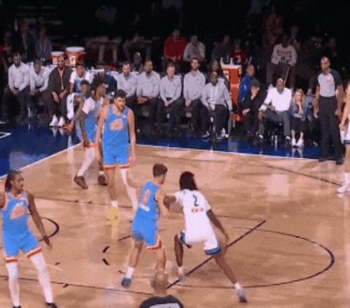 之后面對隊友克林根,楊瀚森持球大跨步晃開大根完成上籃。