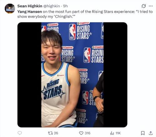 楊瀚森還談到全明星新秀賽最有趣的部分是展現(xiàn)自己的‘中式英語’。