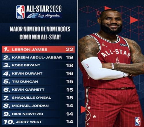 最近外媒整理了一份“NBA全明星入選次數(shù)最多”的歷史榜單,詹姆斯以22次把第一名拉出明顯差距,阿卜杜勒-賈巴爾19次、Kirby18次緊隨其后,杜蘭特也已經(jīng)來到16次。另一邊,鄧肯、加內(nèi)特、奧尼爾同為15次,喬丹、諾維茨基、韋斯特則并排停在14次這一檔——同一批傳奇名字?jǐn)[在一起,入選次數(shù)把層級一眼就分出來了。(數(shù)據(jù)截至2026年2月4日)