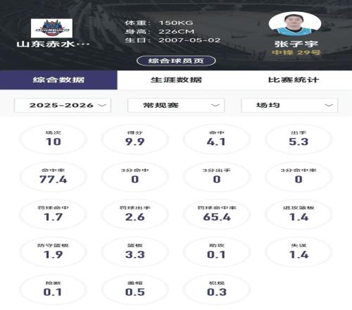 張子宇WCBA職業(yè)生涯第一個(gè)賽季的數(shù)據(jù)最后定格在了十場(chǎng)比賽,場(chǎng)均8.5分鐘,得9.9分3.3籃板0.1助攻0.5蓋帽1.4失誤。