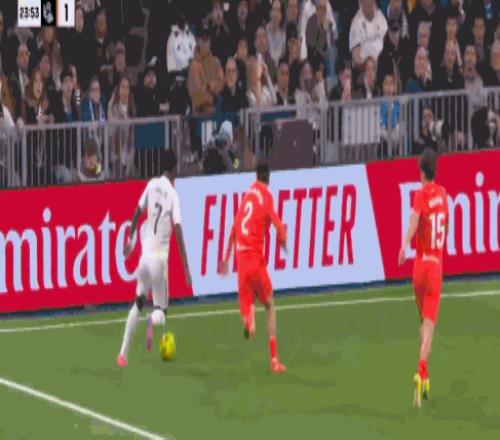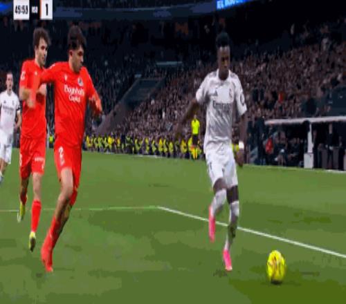 第44分鐘,維尼修斯突破虛晃后射門,被皇家社會(huì)后衛(wèi)擋出