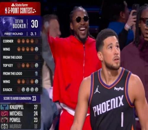 第七位登場(chǎng)的是衛(wèi)冕冠軍布克,他第一個(gè)點(diǎn)命中4球,左側(cè)弧頂5中5表現(xiàn)出色,但隨后超遠(yuǎn)球不中。布克中路命中3球,右側(cè)超遠(yuǎn)球也不中,右側(cè)弧頂命中4球,最后花球點(diǎn)再中4球,布克得到30分表現(xiàn)出色。