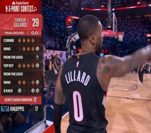 利拉德在決賽第二位登場(chǎng),他在第一個(gè)點(diǎn)命中4球,第二個(gè)點(diǎn)再中4球包括花球,隨后超遠(yuǎn)球命中。利拉德中路弧頂5中5表現(xiàn)出色,左側(cè)超遠(yuǎn)球不中,左側(cè)弧頂再中4球,最后一個(gè)花球點(diǎn)命中3球,利拉德得到29分比預(yù)賽成績(jī)高出2分。