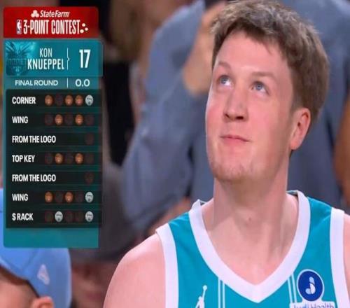 預(yù)賽比拼,第一位登場(chǎng)的是黃蜂新秀克努佩爾,他在第一點(diǎn)命中3球包括花球,第二個(gè)點(diǎn)命中3球,隨后超遠(yuǎn)球不中,中路弧頂命中4球,隨后右側(cè)弧頂超遠(yuǎn)球??伺鍫栔髠?cè)翼5連中手感火爆,底角命中3個(gè)花球,成功得到27分表現(xiàn)出色。