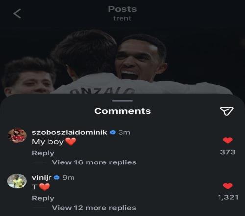 賽后,阿諾德更新社交媒體動(dòng)態(tài)寫道:“回來(lái)真好”隨后,維尼修斯、利物浦球星索博斯洛伊評(píng)論。維尼修斯寫道:“T??”;索博斯洛伊寫道:“我的男孩??”
