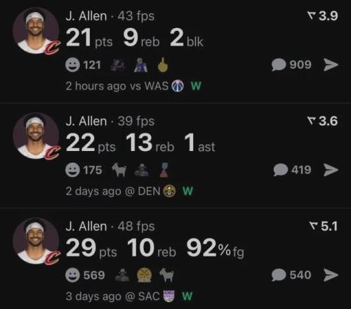 跟哈登這樣的傳球大師合作,最開心的莫過于騎士內(nèi)線球員,比如阿倫最近三場比賽在前者喂餅下,分別貢獻(xiàn)29分10板、22分13板和21分9板,直接打出全明星級別中鋒的數(shù)據(jù),盡管人家早在21-22賽季就入選過全明星。