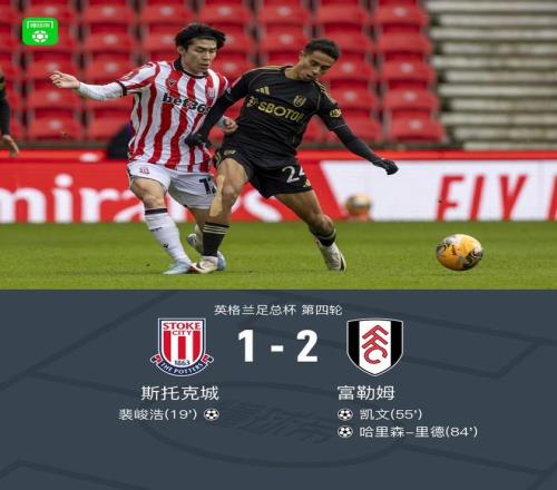 北京時(shí)間2月15日英格蘭足總杯第四輪,斯托克城對(duì)陣富勒姆。斯托克城裴峻浩破門。富勒姆凱文、哈里森-里德分別破門。最終富勒姆客場(chǎng)2-1逆轉(zhuǎn)斯托克城晉級(jí)。