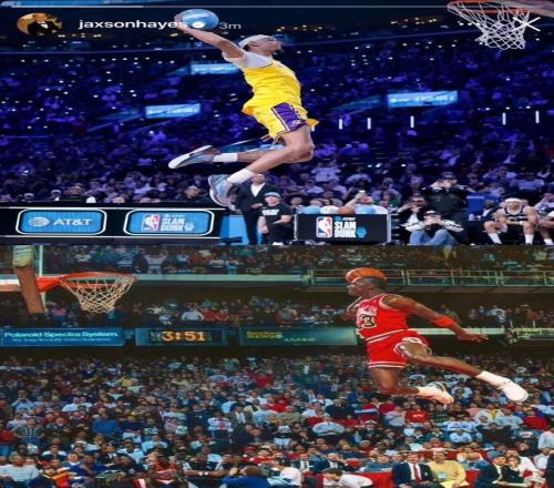 體育播報2月16日宣 今日湖人球星海斯更新IG動態(tài),曬出自己昨日扣籃大賽與邁克爾·喬丹“罰球線”扣籃對比圖(目前已經(jīng)刪除)。