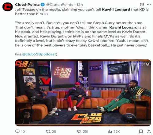 前NBA球員杰夫-蒂格也談到了倫納德本賽季的表現(xiàn),他表示:你們不能說凱文-杜蘭特比倫納德更強。倫納德處于巔峰狀態(tài)且健康時,我認(rèn)為他的水平跟杜蘭特是一致的,雖然杜蘭特贏得了MVP與FMVP,所以確實有一點差距,但說倫納德不比他差也不算離譜。我是說,他真的是NBA歷史上最頂級的球員之一…… 就是老不打比賽。