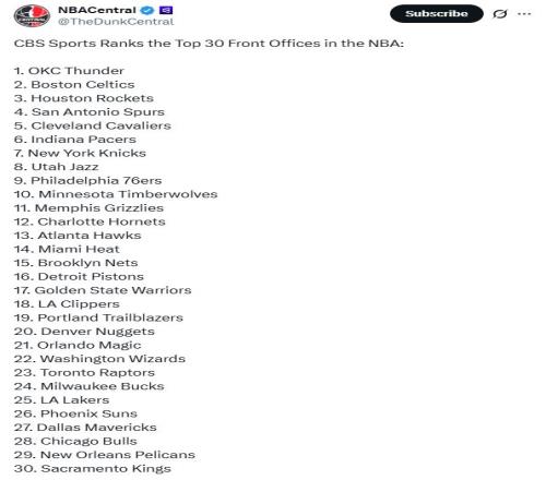 常規(guī)賽過半進(jìn)入全明星周末之際,美媒《CBS》根據(jù)本賽季前半程最新表現(xiàn)重新評價(jià)NBA各隊(duì)管理層水平排名,其中雷霆隊(duì)毫無疑問高居第一,陷入困境的火箭隊(duì)仍高居第3,勇士隊(duì)17名,湖人僅排25位。