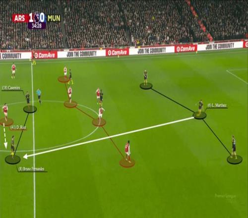 曼聯(lián)的主要套路還是二打二的配合,像3-2擊敗阿森納之戰(zhàn),B費和多古就這樣突破中路,攻入了球隊的第二球。