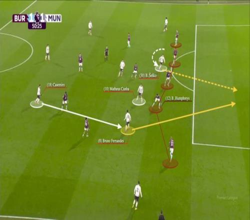 而如果位置后撤,需要在跑動中與對方進行身體對抗,B費的發(fā)揮就遜色得多了。因此,在防守中,卡里克安排曼聯(lián)落位簡單的442陣型,姆貝莫和B費站在前鋒位置。對曼城的比賽,他們迫使對方失誤,B費差點助攻姆貝莫形成單刀。