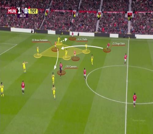 在2-0擊敗熱刺的比賽里,B費的跑位迷惑了熱刺左后衛(wèi)德斯蒂尼·烏多吉,隨后傳給卡塞米羅,「胖虎」與姆貝莫配合未果,B費又率先做出反應(yīng),第一時間傳中給左側(cè)的盧克·肖,后者助攻阿馬德·迪亞洛得分,可惜因為越位被判無效。