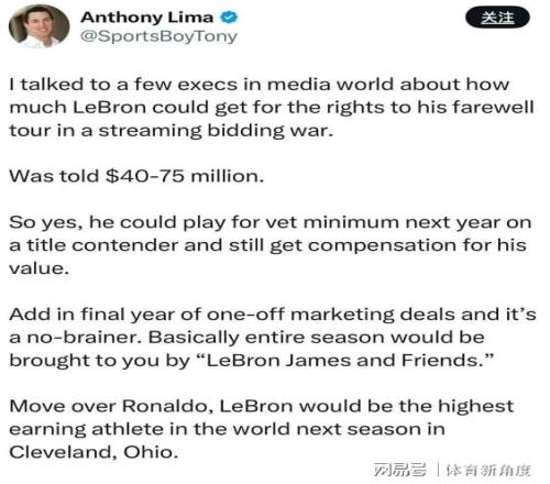 今日,克利夫蘭當(dāng)?shù)氐拿襟w人Anthony Lima,在談及詹姆斯下賽季的去向時(shí),更是語(yǔ)出驚人:“我與幾位傳媒界的大佬深入交流了一番,探討了勒布朗退役巡演的轉(zhuǎn)播權(quán),在流媒體平臺(tái)上的競(jìng)價(jià)大戰(zhàn)中,他個(gè)人究竟能斬獲多少真金白銀。據(jù)我所知,這個(gè)數(shù)字,將是一個(gè)天文4000萬(wàn)至7500萬(wàn)美元之間。