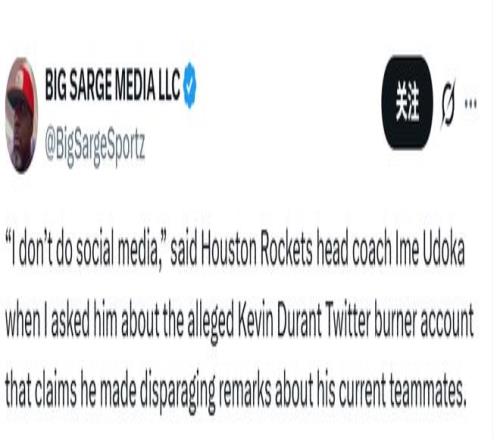 火箭主帥烏度卡被問及此事,回應道:“我不玩社交媒體?!?/p>