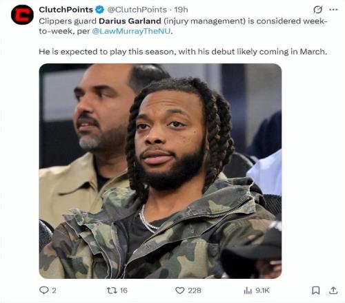 勞里-穆雷還透露快船每一周都要對(duì)加蘭的傷勢(shì)進(jìn)行新的評(píng)估,預(yù)計(jì)他首次身披快船球衣登場(chǎng)會(huì)在三月份。