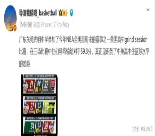這不,近日NBA全明星周末,中國隊便參加了他們的高中g(shù)rind session比賽。廣東東莞光明中學(xué)代表中國隊出戰(zhàn),面對同為高中生的美國隊,中國隊最終三戰(zhàn)全敗。首戰(zhàn)面對ANTHEM PREP,中國隊以41-92狂輸對手51分。而在第二場比賽,面對PROLIFIC隊時,中國隊再次以27-99慘敗給對手,單場足足輸了72分。而第三場比賽,面對western reserve隊,中國隊又一次慘敗,以39-94不敵對手,單節(jié)又輸了55分。