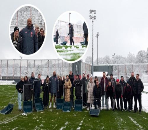 拜仁工作人員清理積雪確保球隊正常訓練,孔帕尼與他們合影致謝