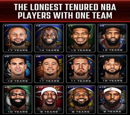 最近有一份“現(xiàn)役球員在當(dāng)前球隊效力時間最長”的榜單流傳出來,庫里、格林、阿德托昆博這些名字一上來就把“年限”拉得很夸張。往下看,恩比德、約基奇、布克、阿德巴約也都在榜上,基本都是各隊長期核心。榜單只列了12人,更多在隊時間不短的現(xiàn)役球員沒被寫進(jìn)來,但單看這12個數(shù)字已經(jīng)夠直觀。問題是:詹姆斯在湖人8年也能進(jìn)榜,“抱團(tuán)不忠誠”這頂帽子還真能扣得那么死嗎?(數(shù)據(jù)截至2026年2月7日)