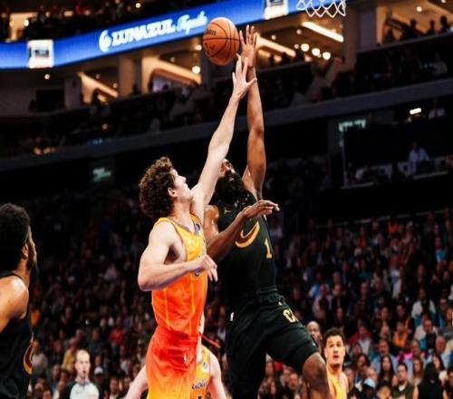 不過第一節(jié)后半段,黃蜂突然啞火陷入得分荒,騎士則抓住機會,米切爾連續(xù)沖擊籃下制造殺傷,帶領(lǐng)球隊占據(jù)主動權(quán)。第一節(jié)比賽結(jié)束,騎士30-20領(lǐng)先黃蜂10分。次節(jié)比賽開始,米切爾借助掩護的三分球一發(fā)入魂,幫助騎士先下一城,克尼普爾三分接球就投立馬還以顏色,米切爾大步流星沖擊內(nèi)線又挑落兩分,克尼普爾手腕一抖,飛身補籃穩(wěn)穩(wěn)得手,哈登后撤步拉球三分一箭穿心,泰森底角埋伏,三分線外搭弓射箭百步穿楊,瑞籃內(nèi)線高舉高打,轉(zhuǎn)身上籃擦板命中,阿倫禁區(qū)吃餅立馬還擊一球。第二節(jié)黃蜂手感回暖,縮小了一些分差,半場比賽戰(zhàn)罷,騎士59-53領(lǐng)先黃蜂6分。